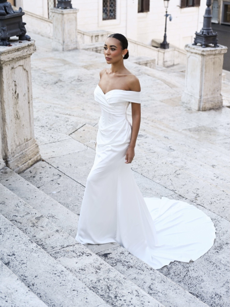 IVORY - Off the shoulder column dress in soft satin with pleated crossover collar, corset bodice & draped front skirt with pearl buttons