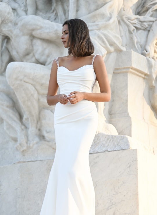 IVORY - Crepe fit and flare dress with pleated and pearl neckline, illusion pearl straps and low back bodice with pearl buttons part of the way down the back.