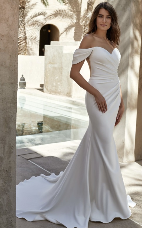 IVORY - Draped front bodice and fit & flare skirt with pleated shoulder drapes in crepe & illusion corset boned back bodice with button detail to hem.