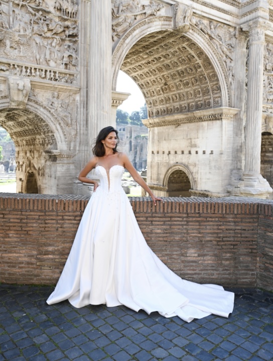 IVORY - Mikado A-Line skirt with scattered pearl beading and deep illusion plunge on a boned and heavy pearl beaded strapless bodice.